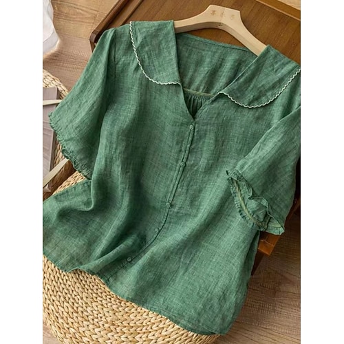Camicia in lino simile cotone finto per donne bottoni colore solido quotidiana base casual camicia a mezza manica colletto tops regolari quotidiana blu bianco rosa arancione verde estate primavera