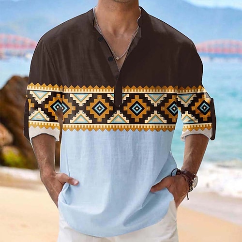 Per uomo Geometrico Azteco Tribale Camicia Camicia con Bottoni Maglia Henley Manica Lunga Vintage Retrò Casuale Vacanza Estate Primavera Collo alla coreana Colletto Mao Stampa 3D Camicia tipo lino