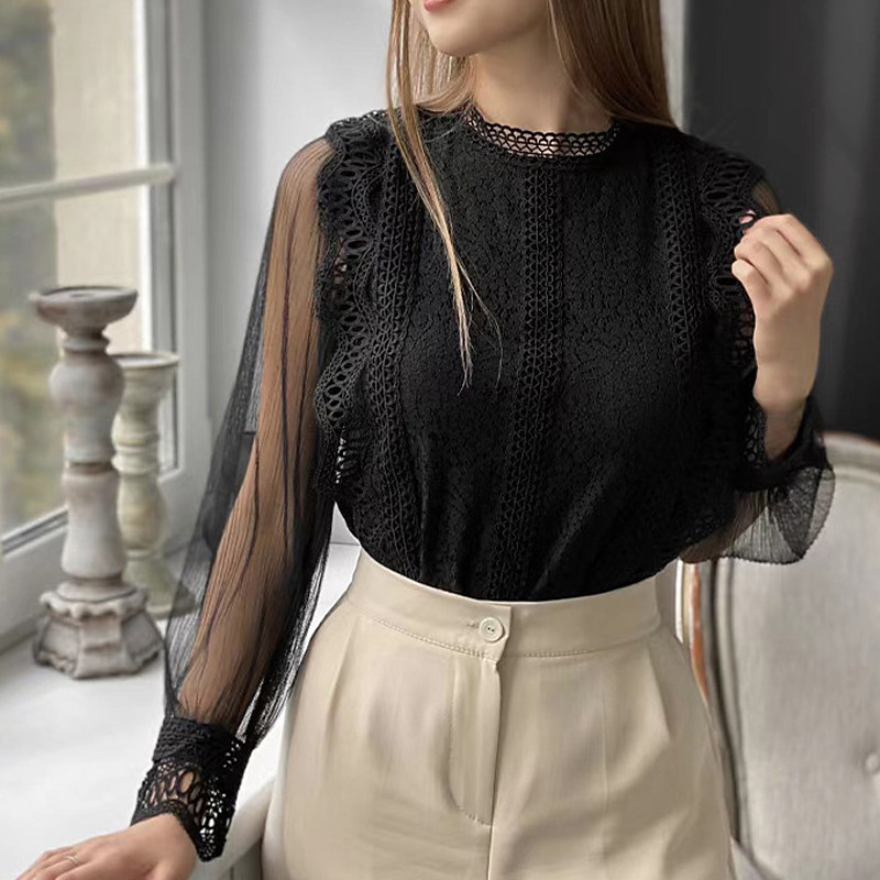 Women's Lace Shirt Blouse Plain Elegant Stylish Long Sleeve Puff Sleeve Crew Neck Regular Tops Holiday Going out Lace Mesh Black White Pink Apricot Summer Spring