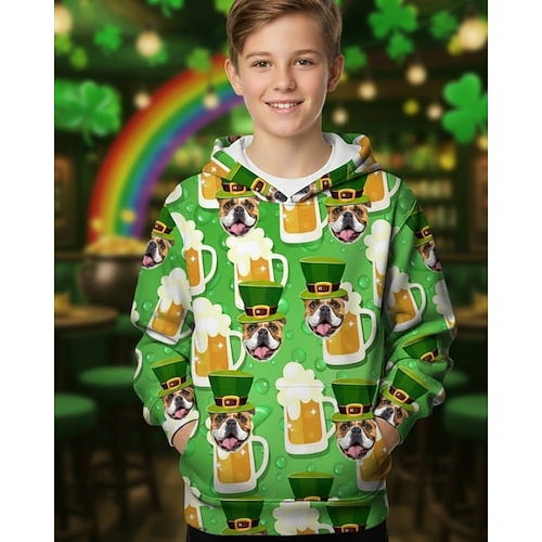 Giorno di San Patrizio Ragazzi 3D Grafico Cane Giorno di San Patrizio Felpa con Cappuccio Maglione Manica Lunga Stampa 3D Primavera Autunno Sport Moda Streetwear Bambini 4-12 Anni Con cappuccio