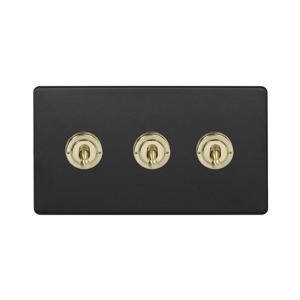 Soho Lighting Matt Black & Brushed Brass 20A 3 Gang 2 Way Toggle Switch Screwless