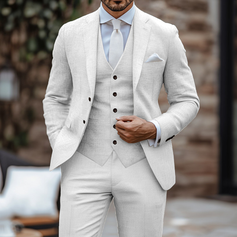 Men's Linen Suits White Summer Wedding Lightweight Casual Solid Colored Standard Fit 2 Piece Single Breasted One-button