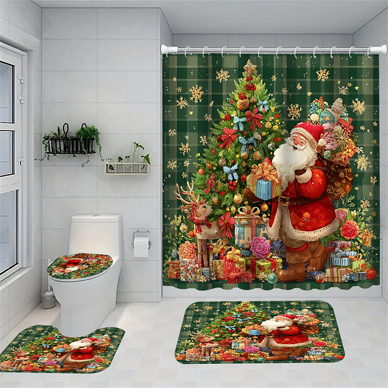 Four Piece Shower Curtain Combination Including Anti Slip Sturdy Toilet Seat And Bathroom Floor Mat Christmas Santa Claus Christmas Tree Pattern Waterproof Polyester Material With 12 Hooks For Bath