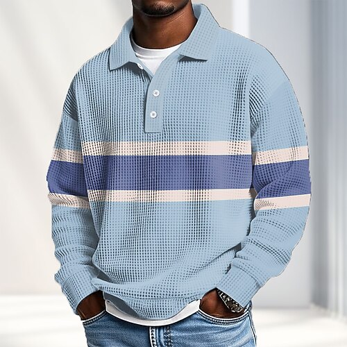 Herren Farbblock Waffel-Poloshirts Textur Langarm Polo-Shirts Revers Lässig Schule Athleisure Alltagskleidung 3D-Druck Herbst Winter Blau Braun Grün