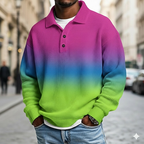 Herren Farbverlauf Waffel-Poloshirts Langarm Polo-Shirts Revers Lässig Schule Athleisure Alltagskleidung 3D-Druck Frühling Herbst Winter Schwarz Marineblau Himmelblau