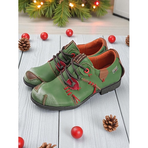 scarpe oxford stringate in pelle verde da donna con dettagli di cuciture rosse, ballerine casual retrò fatte a mano per donne, perfette per outfit natalizi e per l'abbigliamento quotidiano autunnale