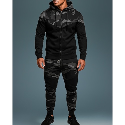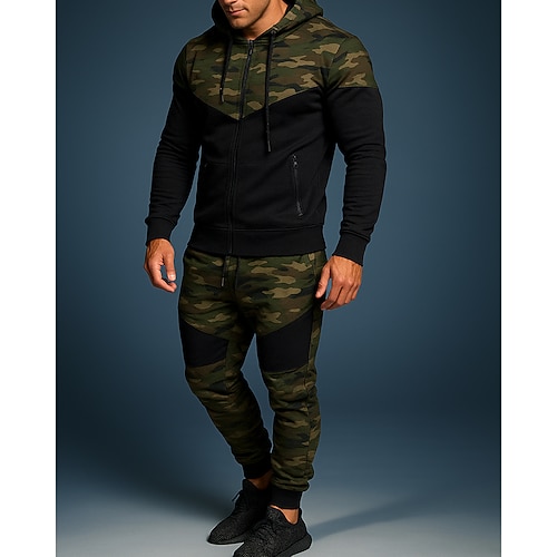 Per uomo Felpa con cappuccio Tuta da Ginnastica Felpa con cappuccio a zip intera Tuta da Allenamento Verde militare Cachi Grigio Con Cappuccio Mimetico 2 Pezzi Sport Outdoor Quotidiano Ferie