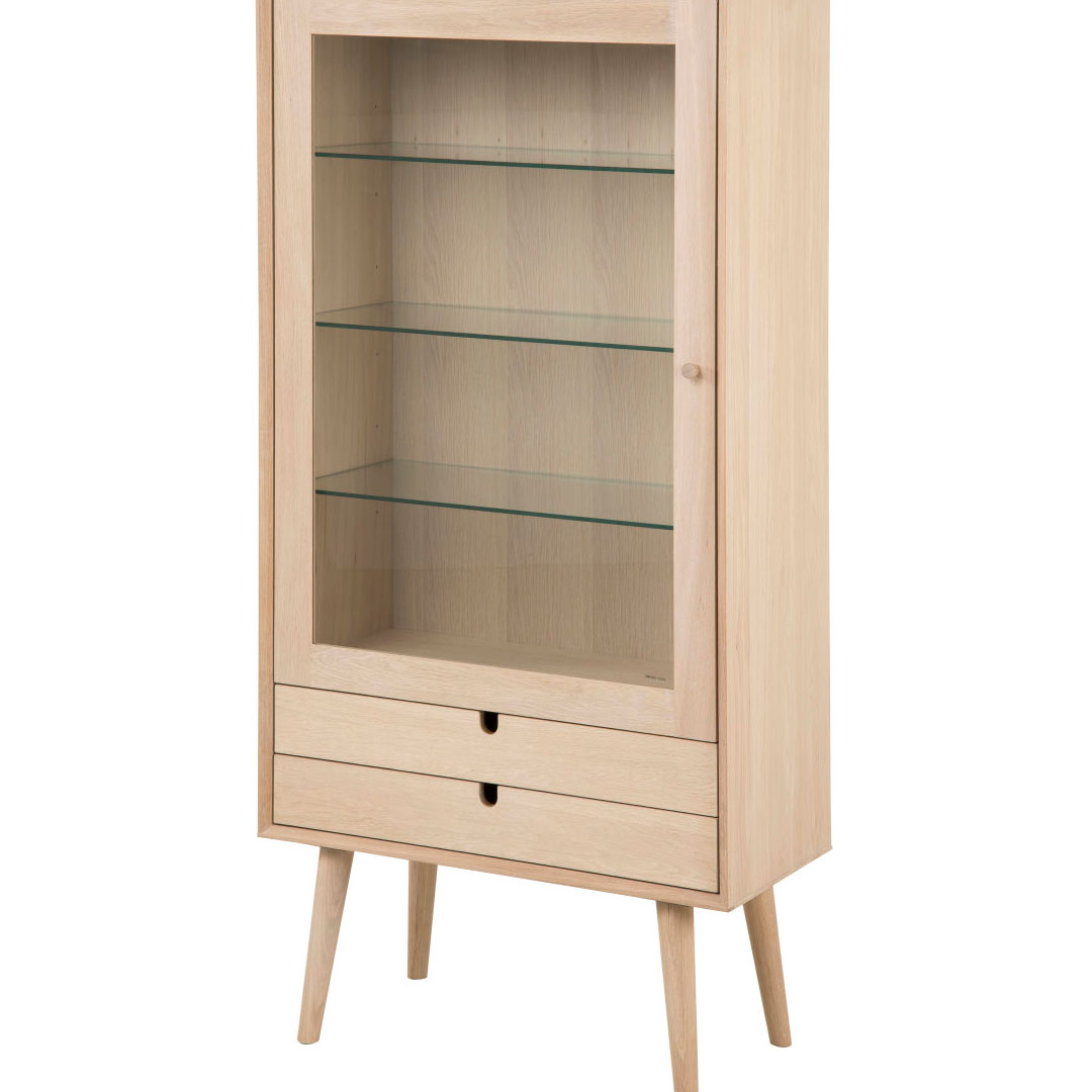 Canes Vitrine mit 1 Tür und 2 Schubladen aus Eiche Furnier und massiv Eiche, weiß gelaugt.