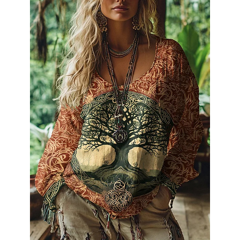 Women's Blouse Graphic Vintage Daily Casual Long Sleeve V Neck Regular Tops Tribal Tree Of Life Vintage Designer Basic Print Vacation Street Going out Daily Holiday Print Wine Summer Spring Fall