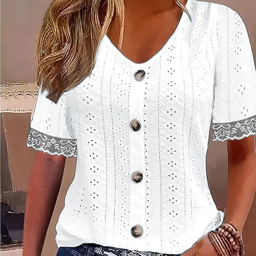 Per donna Top con cuciture in pizzo Top estivi Blusa Top Eleganti Semplice Elegante Vintage Signore Manica Corta Scollo a V Top Regolari Quotidiano Lavoro Ferie Arricciato Pizzo Patchwork Blu Bianco