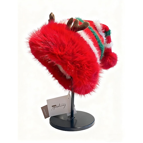 Cappello natalizio a righe da donna con corna di renna – materiale in poliestere, design festoso per feste e abbigliamento invernale