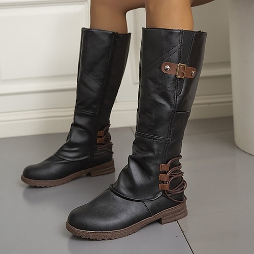 stivali alti fino al ginocchio in similpelle marrone scuro da donna: eleganti stivali con tacco basso per outfit autunnali e invernali