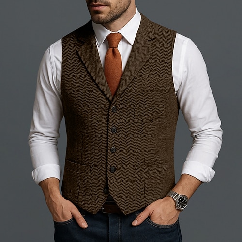 Per uomo Gilet in tweed Gilet Formale Matrimonio Vacanza Quotidiano Moda Classico Primavera Autunno Tasca Bottoni Lana Tweed Confortevole Semplice Spina di Pesce Monopetto Scollo a V Bavero
