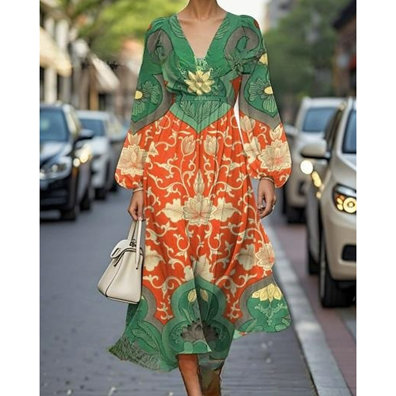 Women's Midi Dress Casual Dress Print Dress Elegant Fashion Outdoor Party Holiday Regular Fit Flower Long Sleeve V Neck Orange Summer Spring