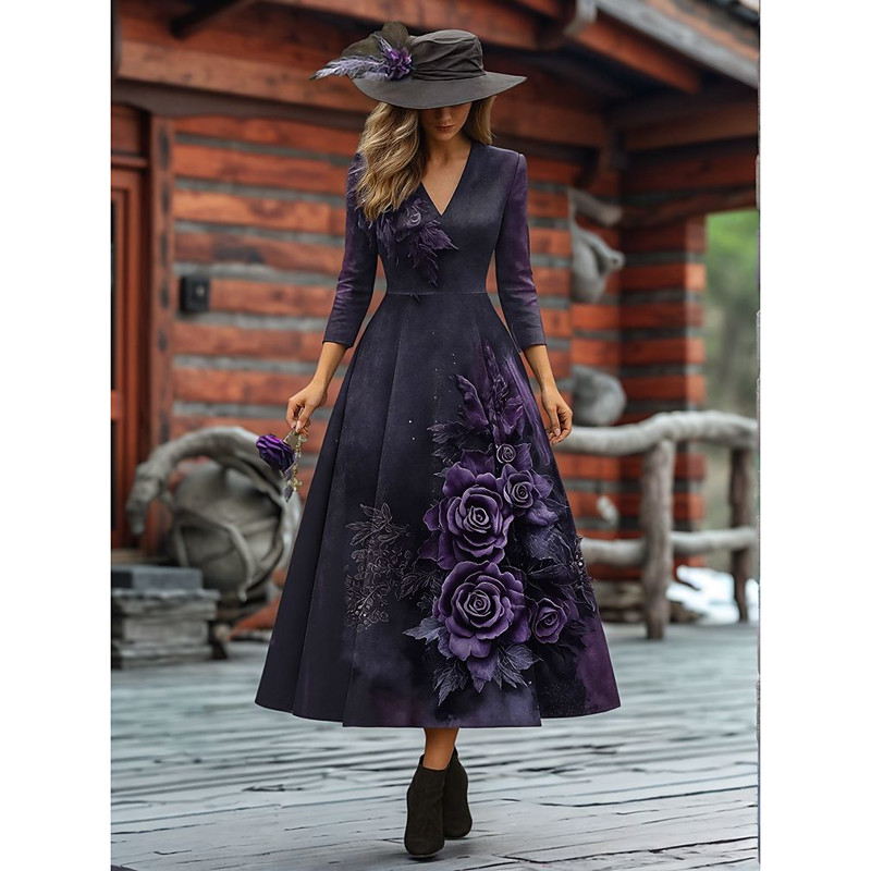 Women's Midi Dress Sundress A Line Dress Halter Dress Vacation Casual Wedding Party Birthday Regular Fit Floral Graphic 3/4 Length Sleeve V Neck Burgundy Purple Green Spring Fall