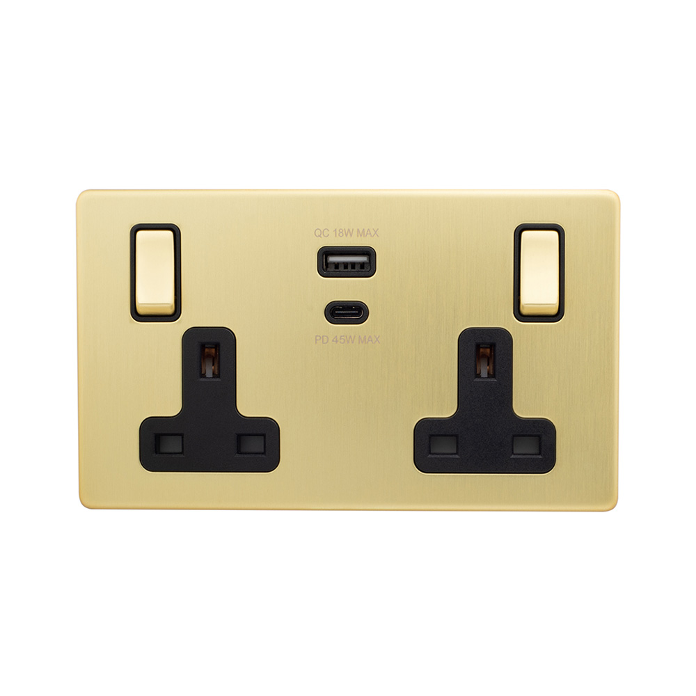 Soho Lighting Brushed Brass with Black Insert 13A 2 Gang Super Fast Charge 45W USB A+C Socket