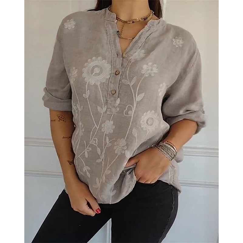 Women's Shirt Dressy Tops Floral Graphic Plain Elegant Ladies Stylish Long Sleeve V Neck Regular Tops Work Daily Holiday Buttons Print White Khaki Gray Spring Fall