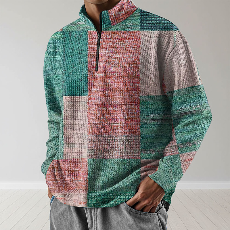 Men's Geometric Plaid Waffle Sweatshirt Fashion Daily Classic Casual Stand Collar Quarter Zip Outdoor Home Office Work Blue Orange Green Gray Zip Up Fall Winter Designer S M L XL XXL XXXL