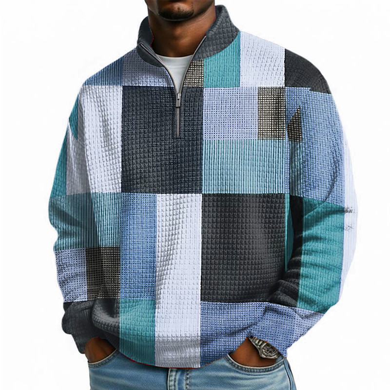 Men's Geometric Plaid Waffle Sweatshirt Fashion Daily Classic Casual Stand Collar Quarter Zip Home Outdoor Office Work Blue Green Khaki Gray Zip Up Fall Winter Designer S M L XL XXL XXXL