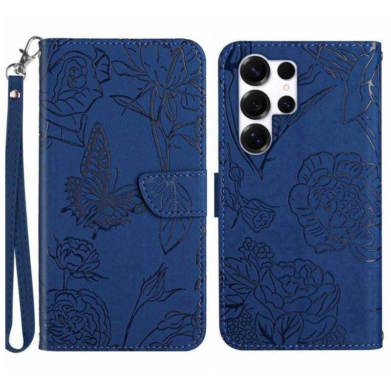Plånboksfodral för Samsung Galaxy S26 Plus Ställ Impräntad Fjäril - Mörkblå
