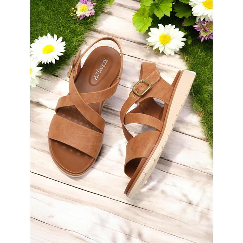 Women's Strappy Buckle Flat Sandals - Cross Band Open-Toe Comfort Sandals for Walking Travel