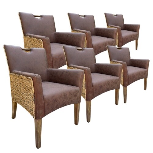 Rattanstuhl Stuhl Set 6 Stück Polsterstuhl mit Armlehnen Darwin Esszimmer Polster Lederoptik muskat