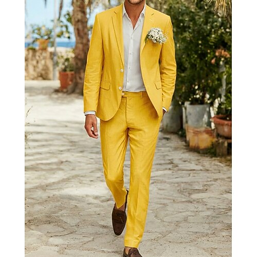 Herren Lässig Strandhochzeit Leinenanzüge Gekerbtes Revers Gelb Rote Mode Täglich Sommer Frühling Einfarbig Figurbetonter Schnitt 2-teilig Einreihige Zwei-Knopf-Jacke
