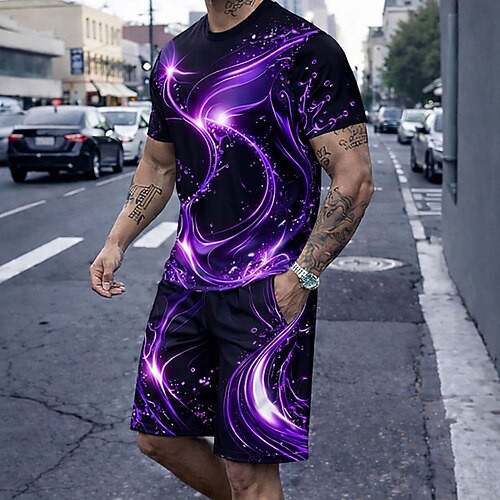 Herren Geometrisch 2St T-Shirts-Sets Sommeroberteile Kurzarm Kurze Hosen Rundhalsausschnitt Sport Lässig Trendy Täglich Outdoor Urlaub 3D-Druck Sommer Blau Rote Purpur