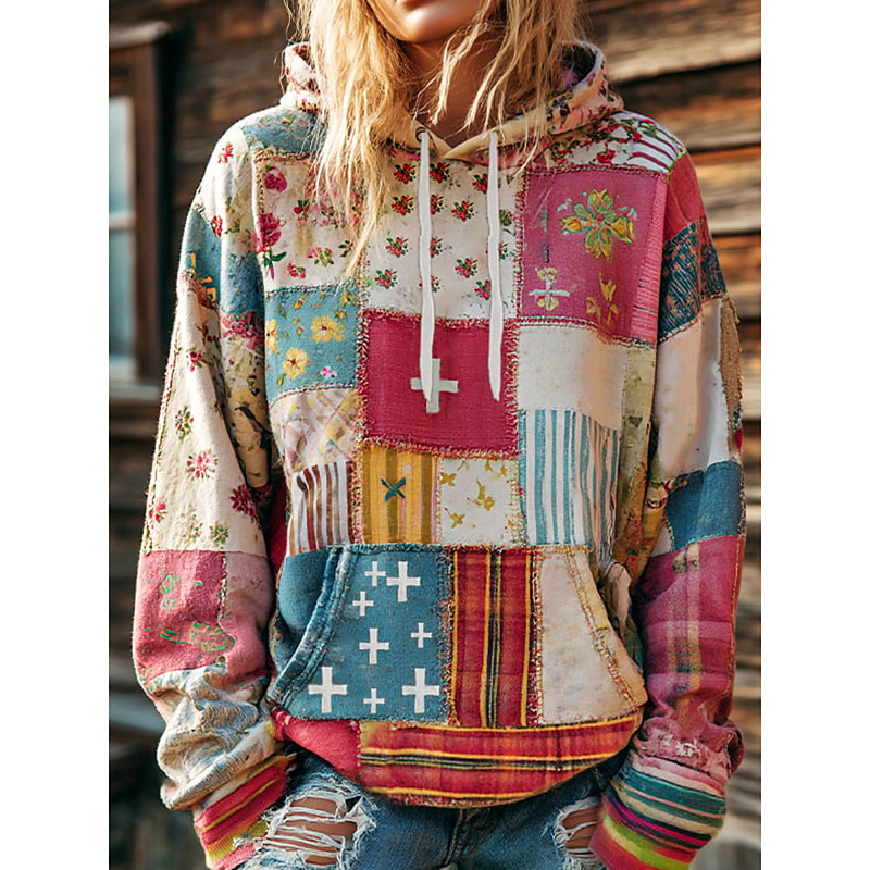 Women's Pullover Hoodie Sweatshirt Floral Graphic Geometric Warm Vintage Casual Long Sleeve Hooded Regular Tops Street Dailywear Casual Print Front Pocket Pink Orange Green Beige Fall Winter