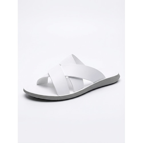 Sandali da uomo in similpelle bianca con incrocio, modello slip-on, leggeri e comodi per le vacanze al mare.