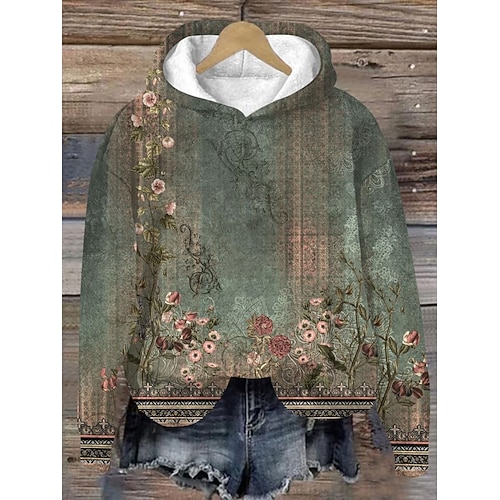 Per donna Felpa con cappuccio Floreale Streetwear Casual Manica Lunga Con Cappuccio Top Regolari Streetwear Ferie Tasca Stampato Vino Verde Autunno Inverno