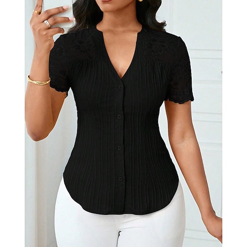 Per donna Camicia Blusa Semplice Elegante Moderno Casual Manica Corta Scollo a V Top Regolari Quotidiano Ferie Uscire Pizzo Bottoni Blu Nero Bianco Giallo Vino Estate Primavera