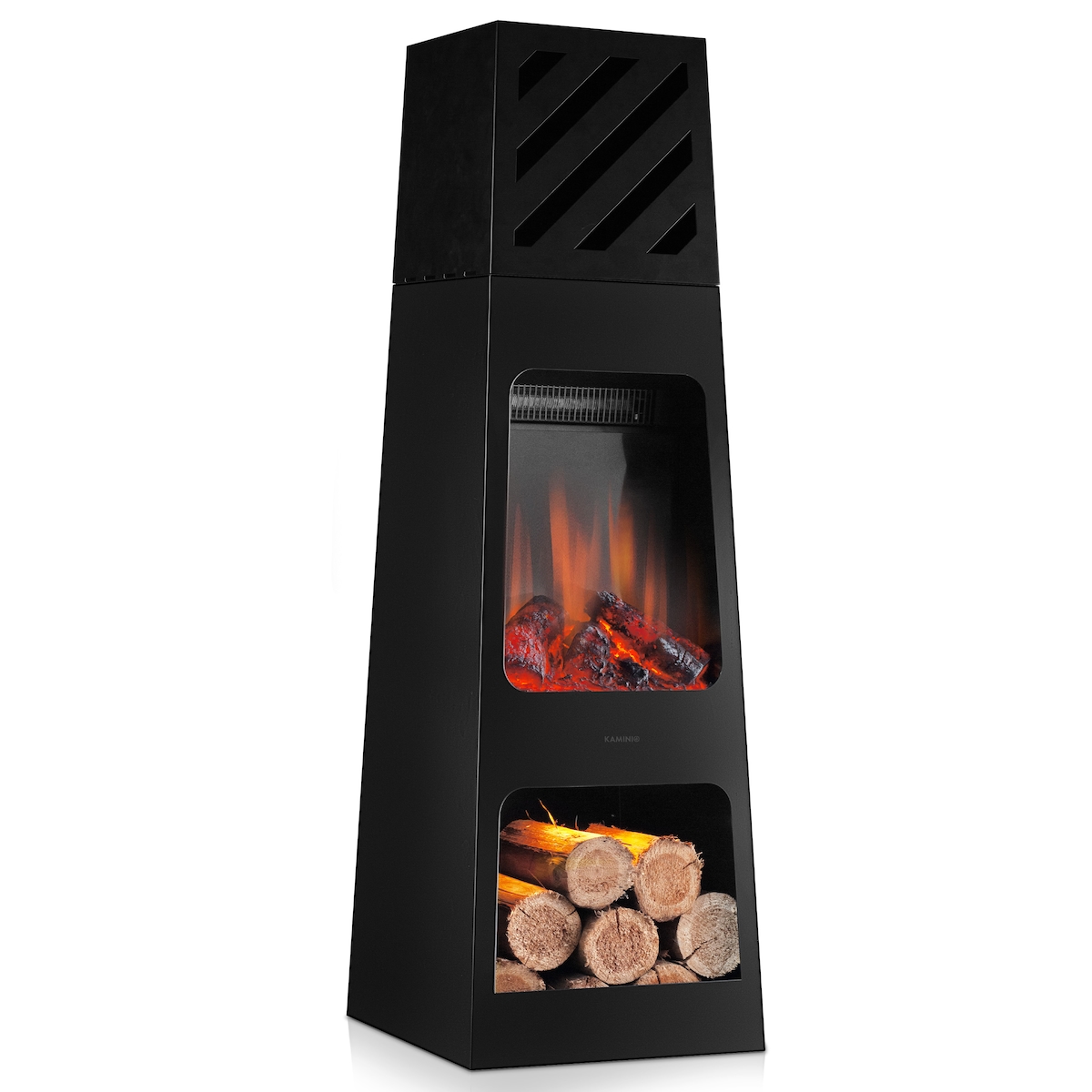 KAMINIO Elektrischer Gartenkamin KAI XL - Elektro Terrassenofen mit Heizung, 3D-Flammeneffekt, Holzfach, LED-Ambientelicht, Fernbedienung - Schwarz