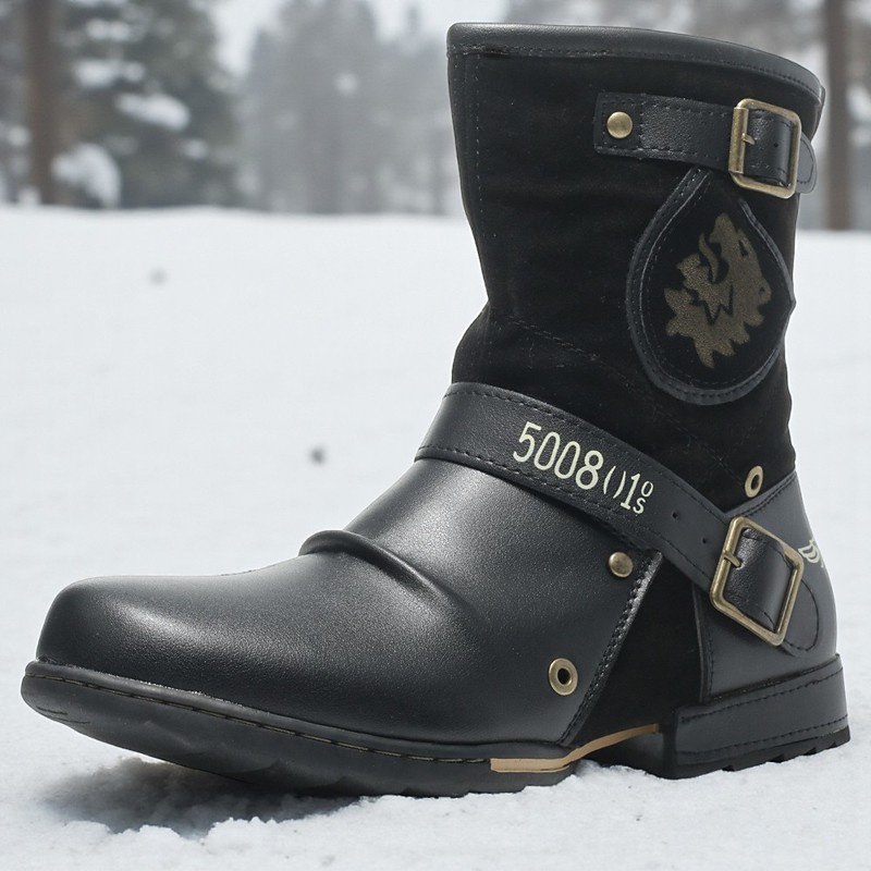 Men's Camouflage Leather Mid-Calf Boots with Buckle Straps, Military Tactical Style Outdoor Work Shoes