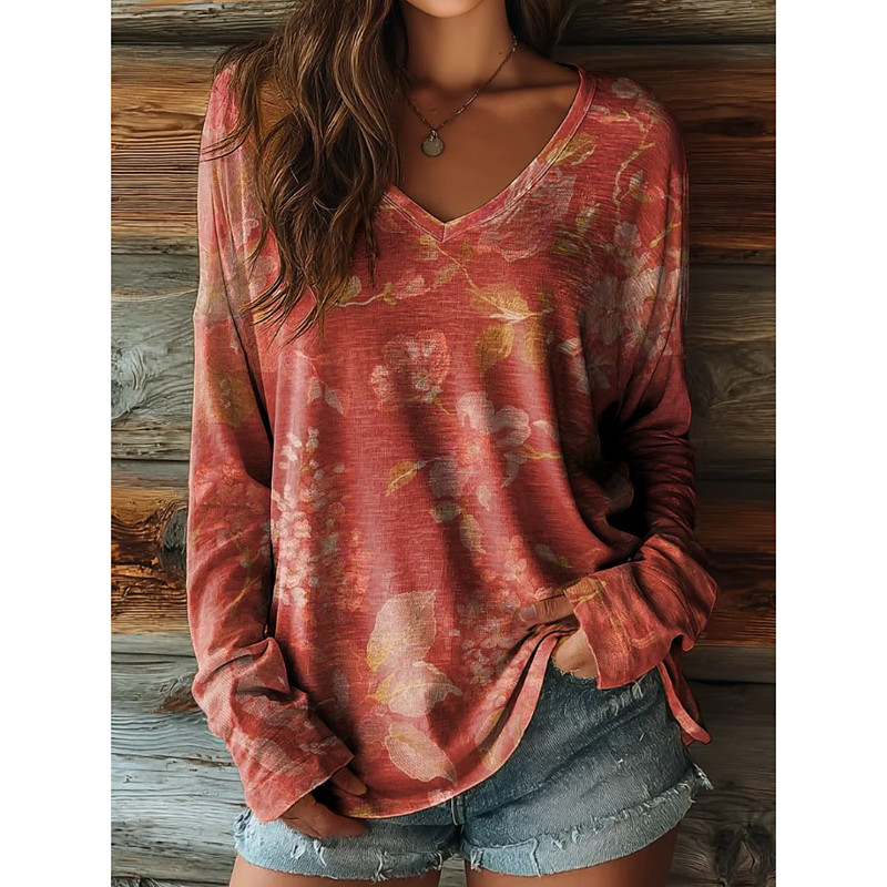 Women's T Shirt Graphic Plants Tribal Vintage Stylish Casual Long Sleeve V Neck Notched Neck Regular Tops Daily Weekend Print Blue Purple Spring Fall Winter