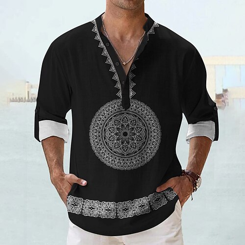 Herren Hemd Knopfhemd Henley Hemd Langarm Tribal Modisch lässig Strand Urlaub Lässig Sommer Frühling Herbst Mandarinkragen Stehkragen Knöpfe Druck Weiß Gelb Blau Beige