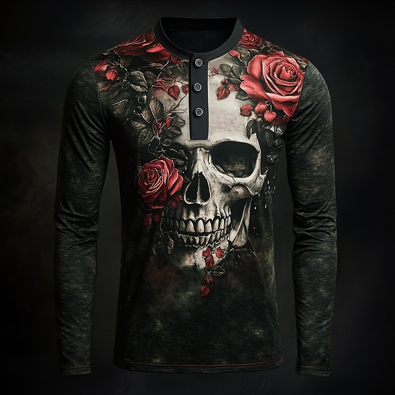 Men's Graphic Skull Henley Shirt Long Sleeve Fashion Cute Daily Casual Holiday Fall Spring Fall Black Henley Henley T-Shirt