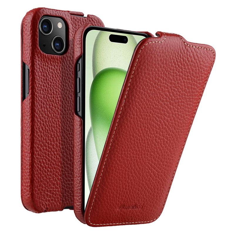 MELKCO Mobilskal till iPhone 15 Plus Vertikalt Flip Äkta Läder + PC Röd