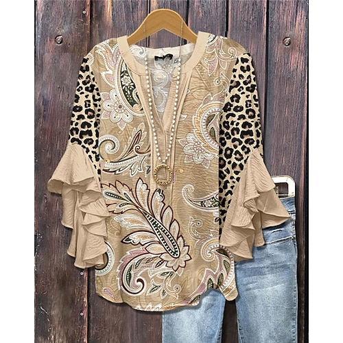 Per donna Maglietta Floreale Moda Moderno Manica 3/4 Scollo a V Top Regolari Quotidiano Volant Stampato Cachi Estate