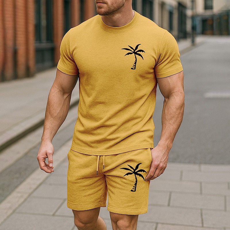Men's T-shirt Suits 2 Pieces Outfits Tee Shorts Short Sleeve Crew Neck Summer Coconut Tree Plain Fashion Casual 2 Piece Vacation Daily Wear Going out Black White Yellow Top Tee for Men