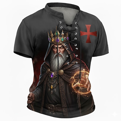 Herren Kreuzritter Mittelalter König Zauberer Goldene Krone Magische Energie Roter Tempelritter Kreuz Fantasy Gothic Retro Krieger Schnür-T-Shirt Allover-Druck Henley V-Ausschnitt Kurzarm Streetwear