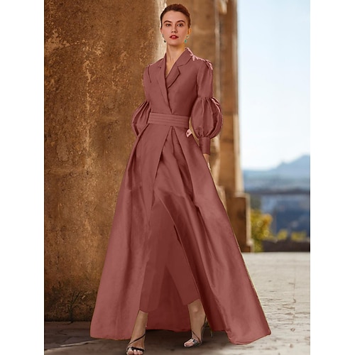 Due Pezzi Tute Lunghezza al pavimento Abito da cerimonia per signora Manica Lunga Colletto a Camicia Elegante Festa Formale Ospite di nozze Taffetà con Fiocco/Fiocchi Tinta unita
