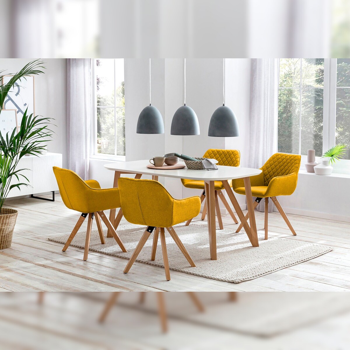 SalesFever Essgruppe 5-tlg. | 160 x 90 cm | Tischplatte weiß + Gestell Eiche | 4x Stuhl Textil gelb + Beine Eiche