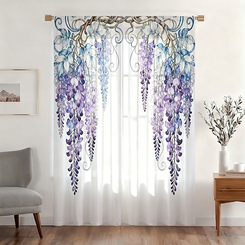 Tenda trasparente per tutte le stagioni, ideale per camera da letto e soggiorno, con motivo di glicine e tralci, elegante decorazione floreale con passante per asta, per un arredamento delicato e