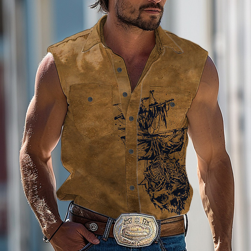Men's Nautical Sailboat Shirt Western Shirt Cowboy Shirt Sleeveless Vintage Western Style Outdoor Work Causal Summer Spring Shirt Collar Khaki
