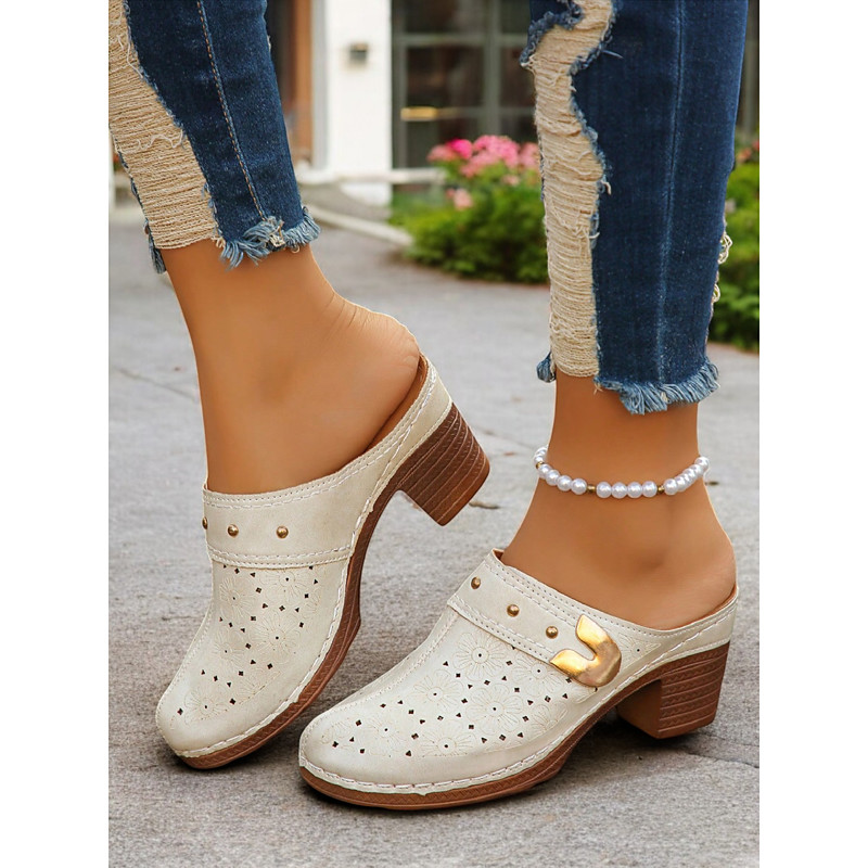 Women's Floral Perforated Mules with Block Heel and Studded Details - Comfortable Slip-On Clogs for Casual Outings and Spring Fashion