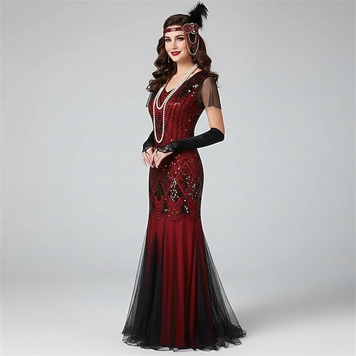 Set Anni Ruggenti Anni 1920 Abito da cocktail Lunghezza alla caviglia Vestito Abiti Abito da Ballo con accessori Maniche corte Il grande Gatsby Taglie Forti Invitato al matrimonio Frangia con nappe