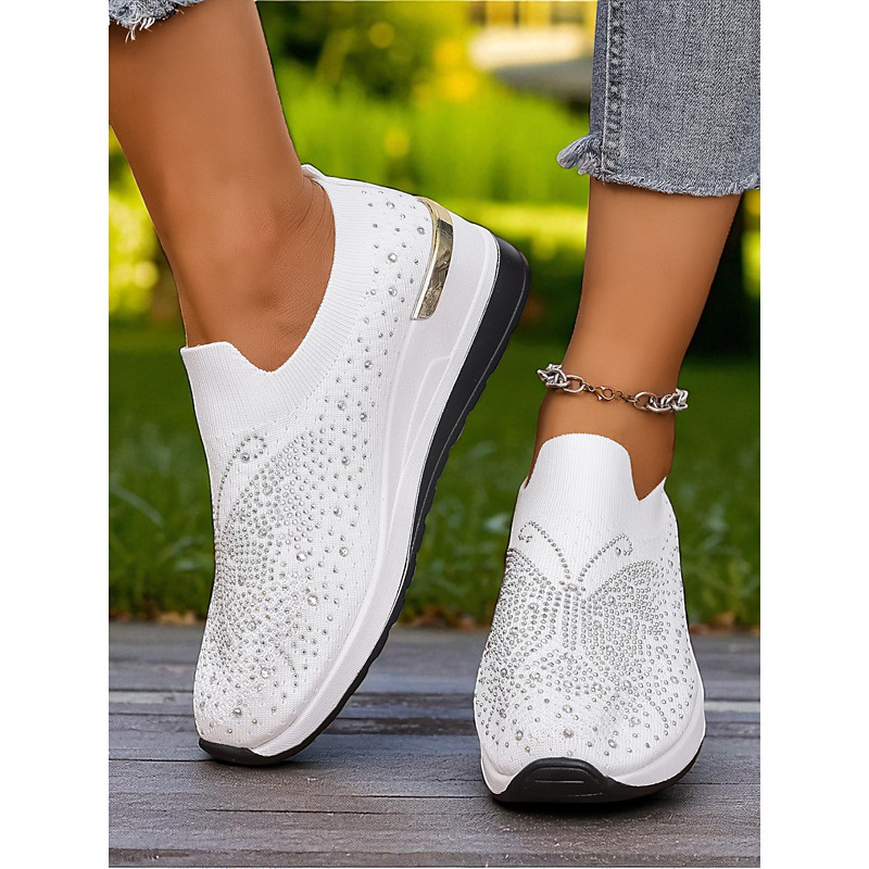 Women's Rhinestone Flyknit Slip-On Sneakers – Sparkling Wedge Shoes for Festivals, Travel and Daily Fashion