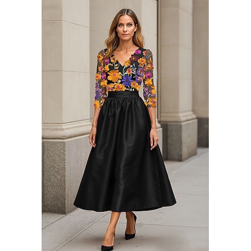 Linea ad A Lunghezza Tè Abito Camicia Abito da sera Abito da cerimonia per signora Manica 3/4 Colletto a Camicia Elegante Vintage Formale Ospite di nozze Derby del Kentucky Raso con Stampa floreale