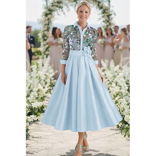 Linea ad A Lunghezza Tè Vestito da Festa Abito da Cocktail Abito da invitata a nozze Abito da cerimonia per signora Manica 3/4 Scollo a V Bavero Elegante Semplice Minimalista Formale Ospite di nozze